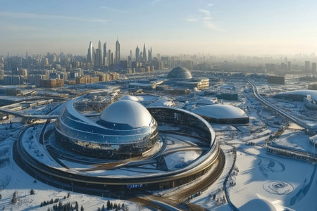 A snowy urban environment showcases sleek buildings and a distant skyline under a clear blue sky.