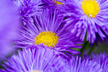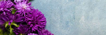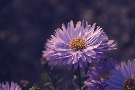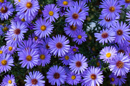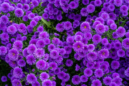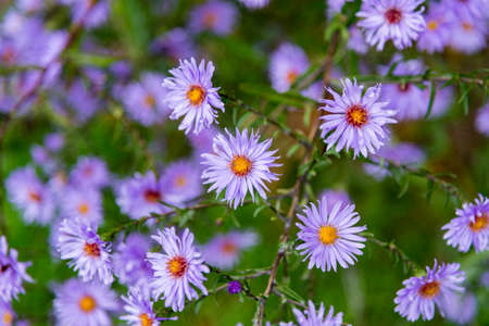 beautiful floral background of autumn flowers. santbrink asters virgin variety Amethyst color purple or violet petals. shallow depth of field blurred background