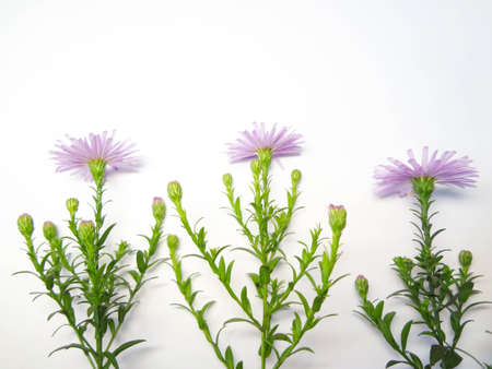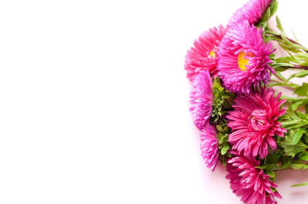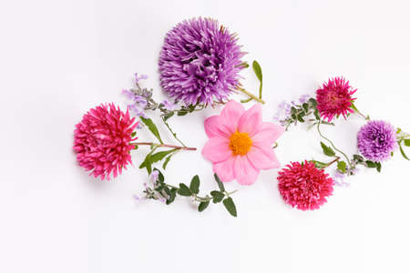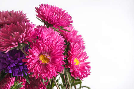 Beautiful bouquet of pink asters flowers on a white background. Lush blooming flowers. Place for text. Flat lay