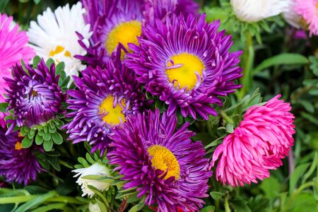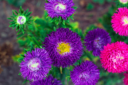 Purple and pink Asters flowers grow in garden top view, selective focus