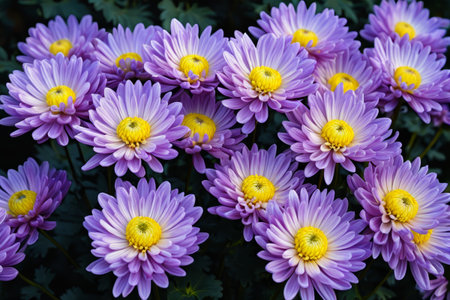 A close up photo of a bunch of pink chrysanthemum flowers with yellow centers. Chrysanthemum pattern in flowers park. Cluster of pink purple chrysanthemum flowers.