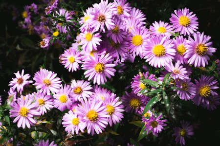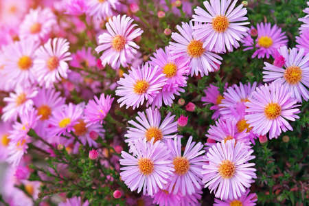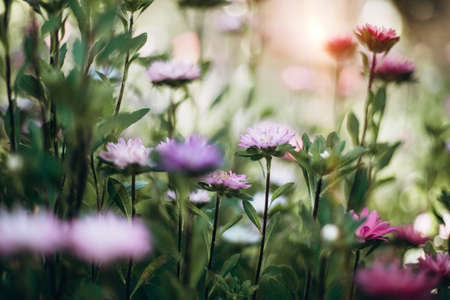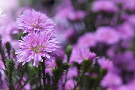 Landscape nature background of beautiful pink Aster flowers in garden. Selective focus.