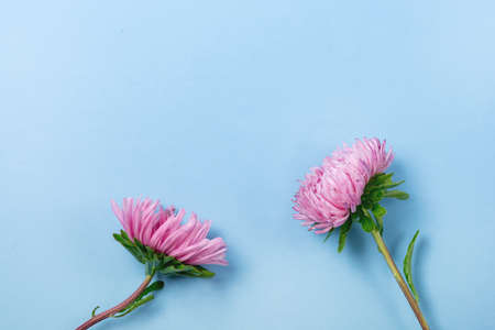 Beautiful Chrysanthemums on Blue Background Holidays Flowers Background Autumn Top View Horizontal