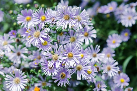 Aster novi belgii on natural green background. Delicate Violet blooming Flower on green background at garden.