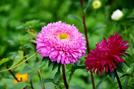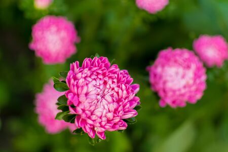 Beautiful pink Aster flowers with green leaves on a green background. Gardening. Autumn harvest. Floriculture. Garden and vegetable garden. Background. Wallpaper. Banner. Texture. selective focus.