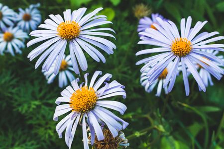 The white aster on a green background in the garden. Summer and spring fantasy flower background. Wide format, free space for design. Floral background concept