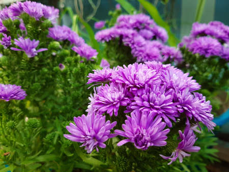 Purple flowers of blooming bush aster with green leaves. Blooming flower. Lilac aster bush. Green leaves. Bouquet of flowers. Frost-resistant garden plants. Background image.