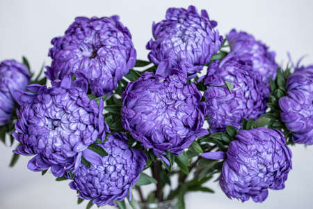 Bouquet of blue chrysanthemums close-up on a white blurred background.