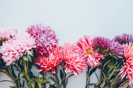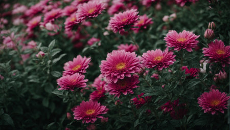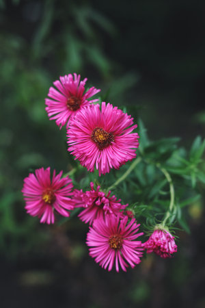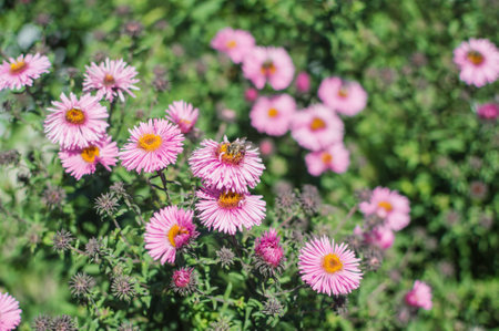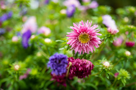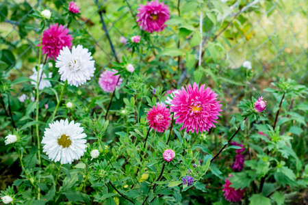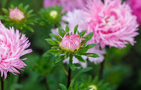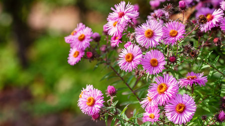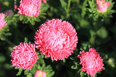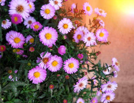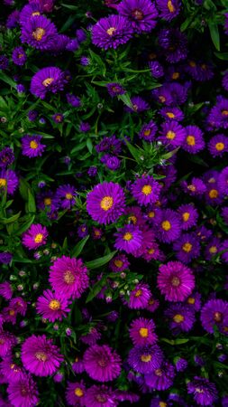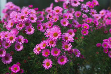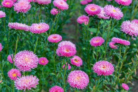 Pink asters flowerbed. Beautiful flowers in the garden. Aster petals close up. Bright romantic floral background. Purple flowers on a green background. Flowering plant