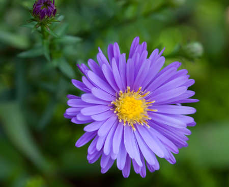 Blue-purple aster flower, close-up. Bright purple aster flower with a white middle in the morning sun. Flowers for the design of flower beds.