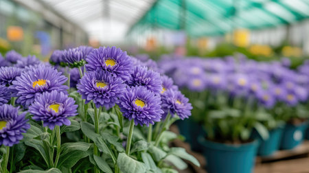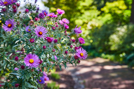 Vibrant Purple Asters with Yellow Centers in Garden Bokeh