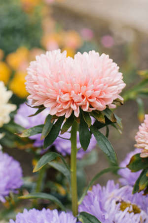Viva magenta aster flower on the background of other flowers. Beautiful aster petals in the sun. side view.