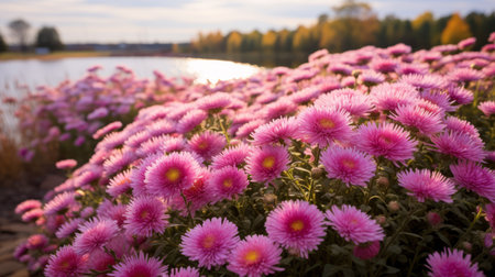 a captivating and eye-catching photo of a flowerbed near a lake, adorned with beautiful pink blooms. the flowers stand out against the brown grass, creating an expansive and captivating scene. the style of lens flare adds a contemporary candy-coated touch, while the softbox lighting enhances the overall appeal. marguerite blasingame's artistic touch is evident in this stunning composition. ai generated