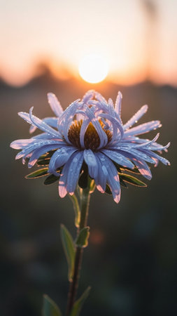 A field of purple daisies with yellow centers is bathed in warm, hazy sunlight, with a blurred background of more...