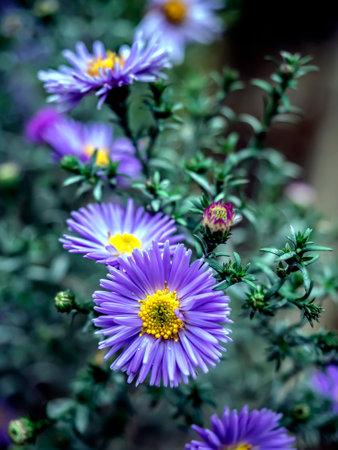 Bush of New York aster (Symphyotrichum novi-belgii) purple colour and bokeh