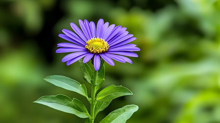 A vibrant purple daisy with yellow center stands against blurred green background, showcasing its delicate petals and fresh green leaves