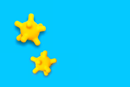 abstract yellow bacterium virus strain model of MERS-Cov on a blue background with copy space, pandemic protection concept mock up top view.