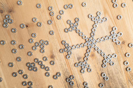 Snowflake made of metal nuts on a wooden table. Winter symbol. Creative idea. New Year and Christmas holiday wait concept. Top view.