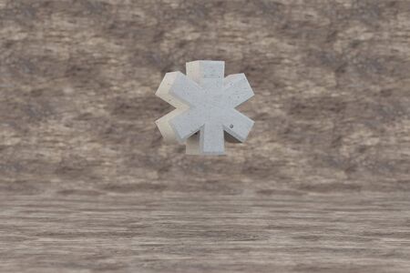 Concrete 3d asterisk symbol. Hard stone sign on wooden background. 3d rendered font character.