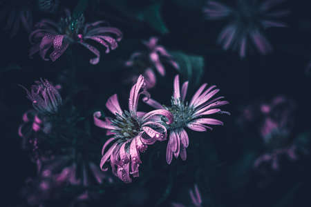 Violet and pink margaret flowers blooming in garden. Close-up beautiful and fresh margaret flowers in natural light. Selective focus