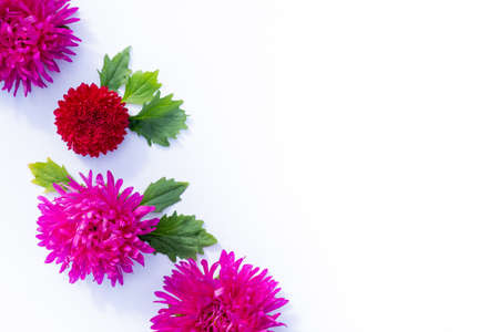 Floral Pattern. Composition with Purple and pink Aster flowers on white background. Wallpaper, printed products. Flat lay.Greeting card and design element.Birthday, Mothers Day, autumn concept