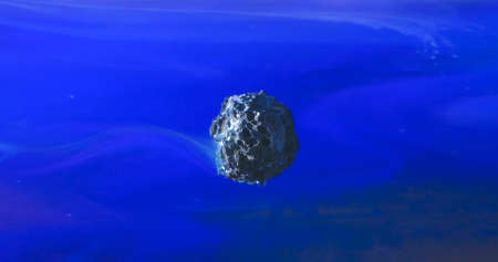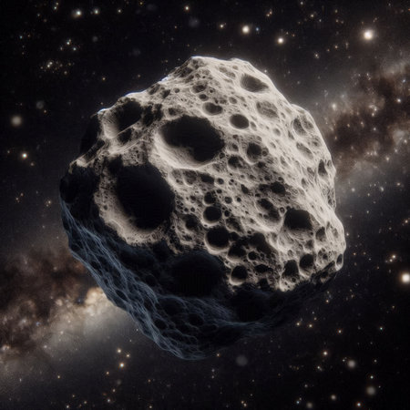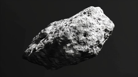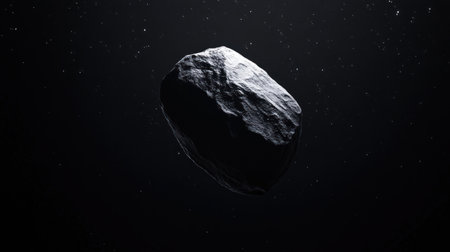 Digital image of small asteroid in space, with a high level of detail and realism, against the black background of deep space. the meteor is depicted as large and round, with detailed texture that mimics rock material. it's positioned at an angle from above, creating a sense of depth within its pro