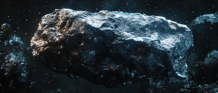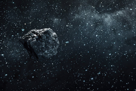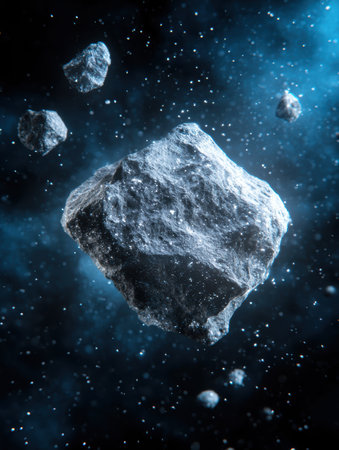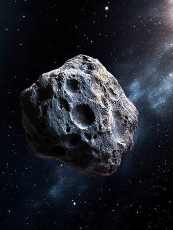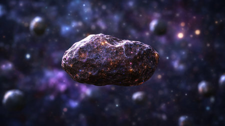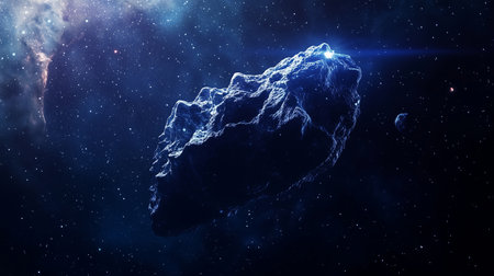 large asteroid floating through deep space, surrounded by stars and distant celestial bodies, capturing the vastness and mystery of the universe.