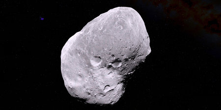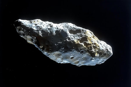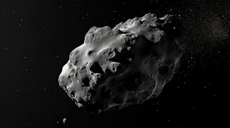 Digital artwork of small, dark grey asteroid floating in black space, seen from the side, with a bumpy texture. the scene has a cinematic, hyper realistic style.