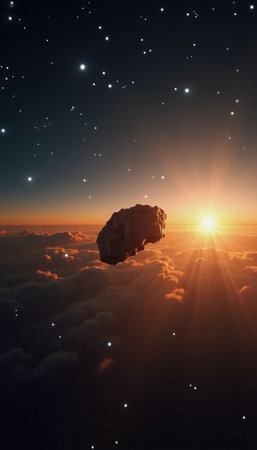 An asteroid drifts through the cosmos, illuminated by the golden rays of a distant sunrise. Below, soft clouds stretch across the expanse of the sky, creating a serene backdrop.