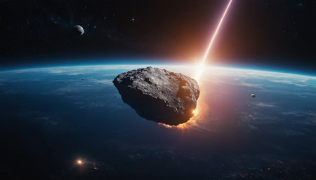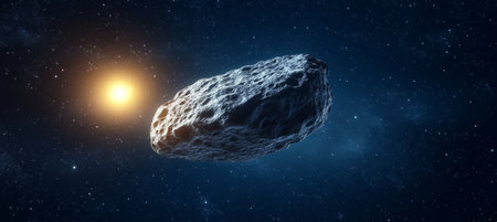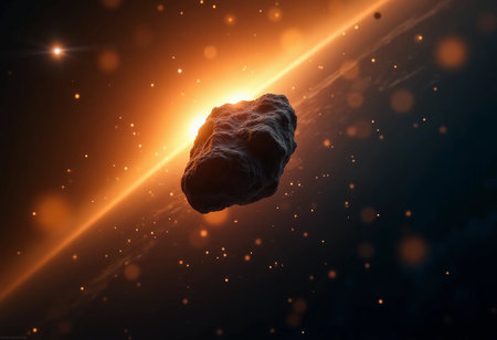 A detailed and captivating view of an asteroid floating in space above Earth, illuminated by sunlight. The surrounding stars create a stunning cosmic backdrop.