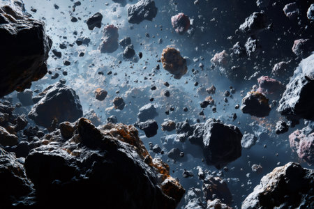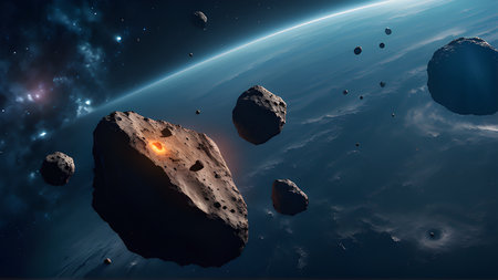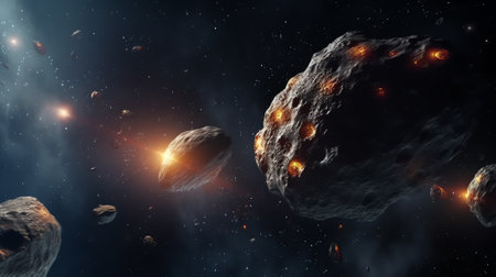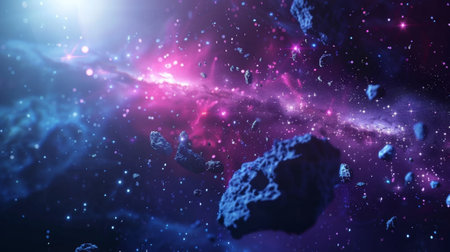 Asteroid belt with glowing meteors and vibrant stars in a vast cosmic space