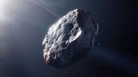 A mesmerizing 3D depiction of an asteroid drifting gracefully through the starry expanse of space, showcasing its rocky surface and bright illumination.