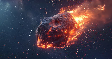 Fiery asteroid shooting through space, leaving a trail of bright flames and debris against the night sky.