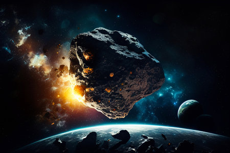 Generative AI : Asteroid in outer space near Earth planet Meteorite on orbit of Earth Ice meteor is solar system Elements of this image furnished by NASA