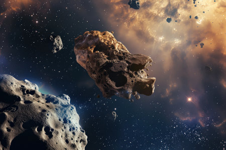 Massive asteroid flying through star studded space, accompanied by smaller rocky fragments against dark cosmic background, highlighting celestial dynamism
