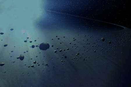 A detailed illustration of an asteroid belt with rocky fragments illuminated by a distant star, creating a rugged, expansive and mysterious cosmic scene