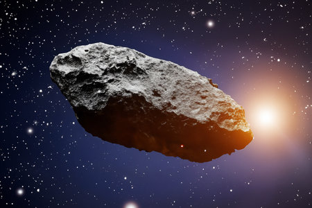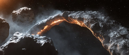 A celestial arrangement of rocks and dust particles in a dark, star-filled expanse, illuminated by a dramatic light source.