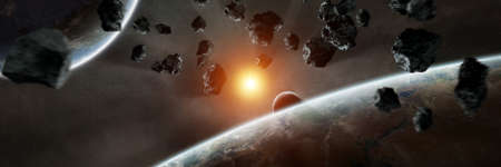 3D illustration of asteroid field. 5K realistic science fiction art.