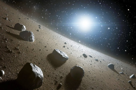 expansive cluster of asteroids in the midst of a hazy universe