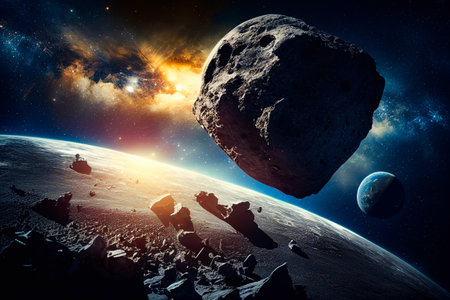 Cosmic Meteor Field with Asteroids and Nebulae in Deep Space