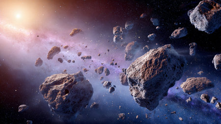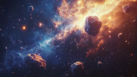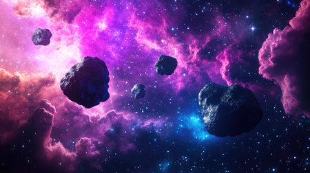 Asteroids floating among vibrant nebulae and distant stars in deep space. the colorful cosmic clouds create an ethereal backdrop, showcasing the raw beauty and mystery of the universe. Generative AI