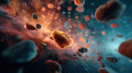 Abstract cosmic scene with glowing asteroids and colorful explosion in deep outer space.