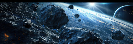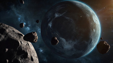 Digital illustration of an asteroid belt orbiting Earth, depicting a concept of space exploration and cosmic debris in a vast universe