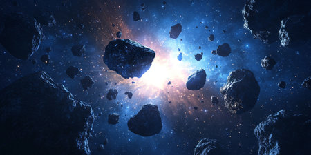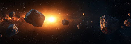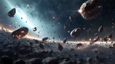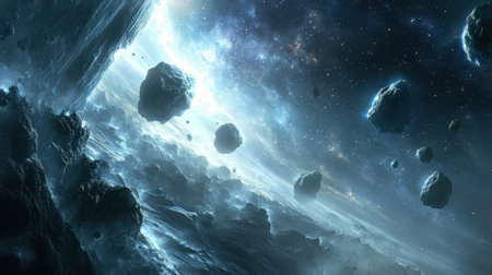 Discover a breathtaking scene showcasing asteroids drifting through the vast depths of space, illuminated by distant stars in the dark background.