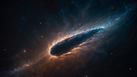 Vibrant asteroid streaking through a star-filled cosmos with glowing debris