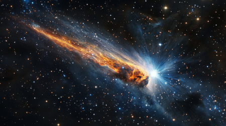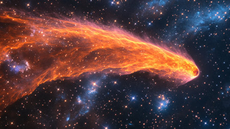 Burning comet tail streaking across the night sky, surrounded by bright stars and deep nebulae generative ai