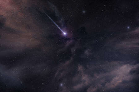 falling star shining in starry and cloudy night sky, comet in a purple nebula
