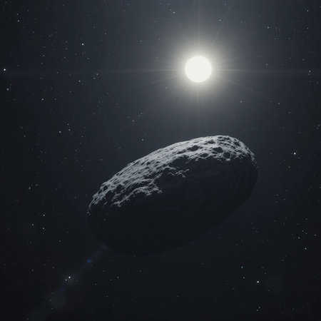 A mesmerizing 3D depiction of an asteroid drifting gracefully through the starry expanse of space, showcasing its rocky surface and bright illumination.