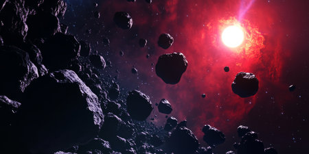 A cosmic 3D background showcasing an asteroid field illuminated by a distant red giant star. The floating rocks cast dramatic shadows, adding depth and realism to this stunning space scene.