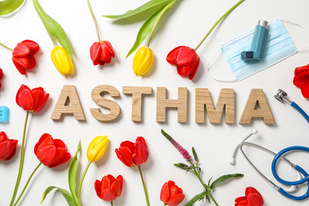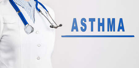 Word ASTHMA on a white background. Nearby is a doctor in white coat and stethoscope. Medical concept